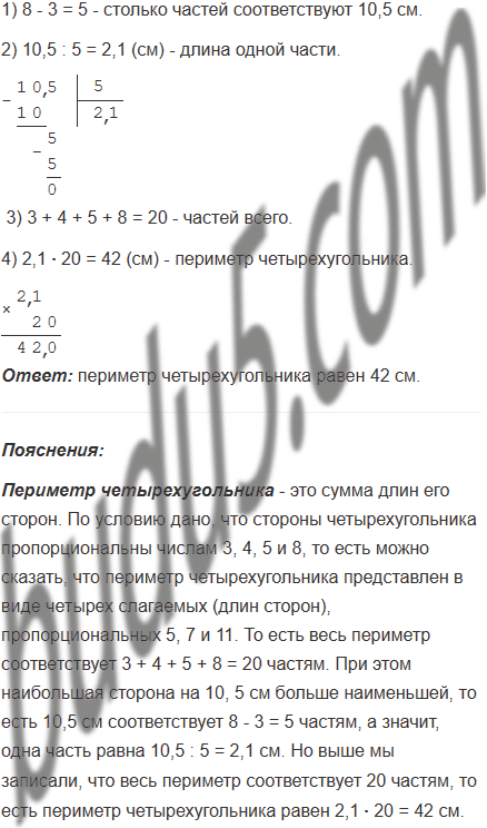 Найдите периметр четырёхугольника, если его стороны пропорциональны числам 3, 4, 5 и 8, а наибольшая сторона на 10, 5 см больше наименьшей.